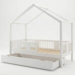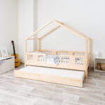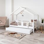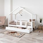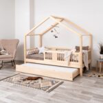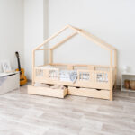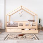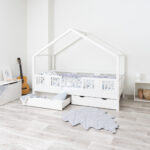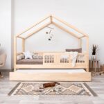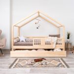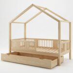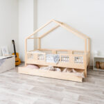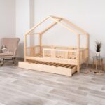 ASTRIA mit Schublade ist ein einzigartiges Einzelbett in Hausform, das Funktionalität, Langlebigkeit und märchenhaften Charme vereint. Dank der erhöhten Konstruktion auf 20 cm hohen Beinen gewinnt dieses Modell eine neue Dimension der Praktikabilität – unter dem Bett können funktionale Schubladen platziert werden, die helfen, Ordnung im Kinderzimmer zu halten oder zusätzlichen Schlafplatz bieten. Die vollständig aus natürlichem Kiefernholz gefertigte Konstruktion garantiert Langlebigkeit, Sicherheit und ein aussergewöhnliches Erscheinungsbild. Das charakteristische Holzdach verleiht dem Ganzen eine unverwechselbare Atmosphäre – es schafft einen Raum, in dem Schlaf, Spiel und Fantasie jeden Tag ineinander übergehen.
