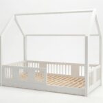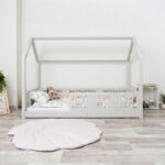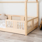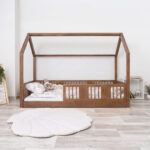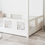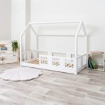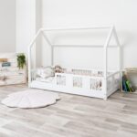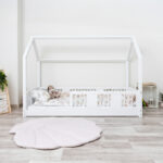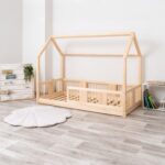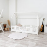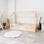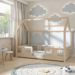 LUMINA mini zeichnet sich durch ein charakteristisches langes Dach in Hausform aus, das eine besonders gemütliche Atmosphäre im Kinderzimmer schafft. Das Bett LUMINA mini ist ein niedriges Einzelbett für Kinder in Hausform, das speziell für die jüngsten Benutzer konzipiert wurde. Seine direkt auf dem Boden stehende Konstruktion gewährleistet maximale Sicherheit, wodurch dieses Modell perfekt als erstes Bett für ein Kind geeignet ist. Die niedrige Rahmenhöhe minimiert das Sturzrisiko und ermöglicht es dem Kleinkind gleichzeitig, selbstständig ins Bett zu steigen und wieder herauszuklettern, was die Entwicklung von Unabhängigkeit und Selbstvertrauen unterstützt.