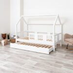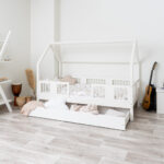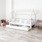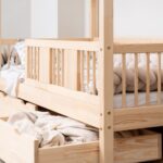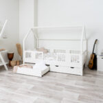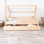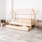 LUMINA mit Schublade zeichnet sich durch ein charakteristisches langes Dach in Hausform aus, das eine besonders gemütliche Atmosphäre im Kinderzimmer schafft. Der Holzrahmen mit dem zarten Dach verwandelt ein gewöhnliches Einzelbett in einen magischen Raum – einen Ort, an dem Schlaf, Spiel und Erholung zu einem verschmelzen. Dank der erhöhten Konstruktion auf 20 cm hohen Beinen gewinnt dieses Modell eine neue Dimension der Praktikabilität – unter dem Bett können funktionale Schubladen platziert werden, die helfen, Ordnung im Kinderzimmer zu halten oder zusätzlichen Schlafplatz bieten. Die vollständig aus natürlichem Kiefernholz gefertigte Konstruktion garantiert Langlebigkeit, Sicherheit und ein aussergewöhnliches Erscheinungsbild. Das charakteristische Holzdach verleiht dem Ganzen eine unverwechselbare Atmosphäre – es schafft einen Raum, in dem Schlaf, Spiel und Fantasie jeden Tag ineinander übergehen.