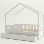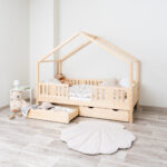 LUNETTA mit Schublade ist ein einzigartiges Einzelbett in Hausform, das Funktionalität, Langlebigkeit und märchenhaften Charme vereint. Dank der erhöhten Konstruktion auf 20 cm hohen Beinen gewinnt dieses Modell eine neue Dimension der Praktikabilität – unter dem Bett können funktionale Schubladen platziert werden, die helfen, Ordnung im Kinderzimmer zu halten oder zusätzlichen Schlafplatz bieten. Die vollständig aus natürlichem Kiefernholz gefertigte Konstruktion garantiert Langlebigkeit, Sicherheit und ein aussergewöhnliches Erscheinungsbild. Das charakteristische Holzdach verleiht dem Ganzen eine unverwechselbare Atmosphäre – es schafft einen Raum, in dem Schlaf, Spiel und Fantasie jeden Tag ineinander übergehen.