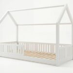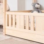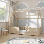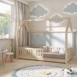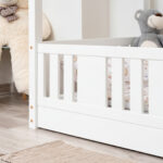 STELLIA mini zeichnet sich durch ein charakteristisches langes Dach in Hausform aus, das eine besonders gemütliche Atmosphäre im Kinderzimmer schafft. Das Bett STELLIA mini ist ein niedriges Einzelbett für Kinder in Hausform, das speziell für die jüngsten Benutzer konzipiert wurde. Seine direkt auf dem Boden stehende Konstruktion gewährleistet maximale Sicherheit, wodurch dieses Modell perfekt als erstes Bett für ein Kind geeignet ist. Die niedrige Rahmenhöhe minimiert das Sturzrisiko und ermöglicht es dem Kleinkind gleichzeitig, selbstständig ins Bett zu steigen und wieder herauszuklettern, was die Entwicklung von Unabhängigkeit und Selbstvertrauen unterstützt.